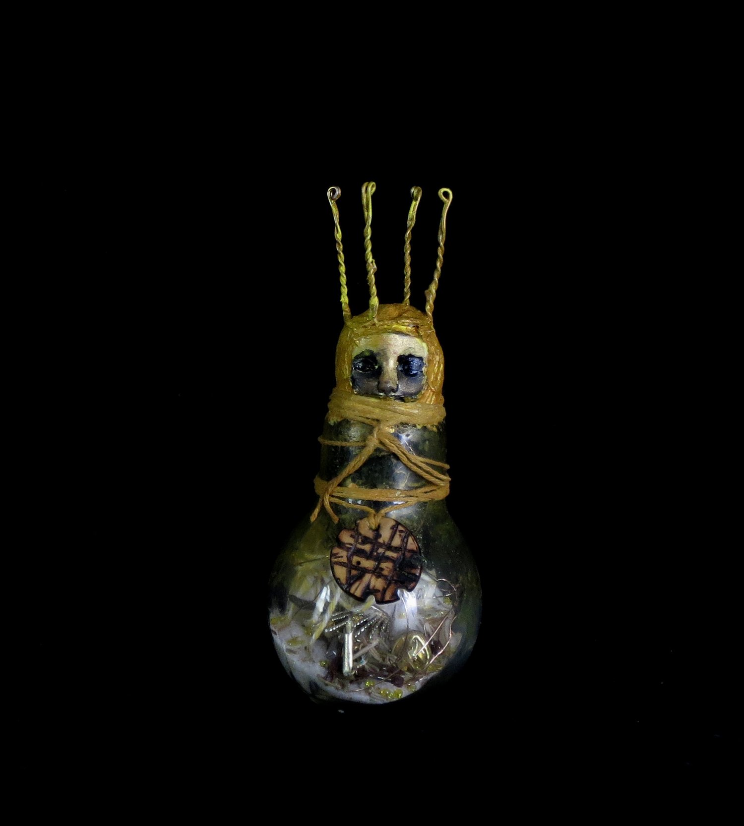 My bottles are filled with things of both entangling and reflective nature. This bottle is about 4 inches tall and is filled with salt, rusted nails, pins, knotted thread, beads, tangled wire and other bits and pieces. The head is sculpted over a permanently sealed top using air dry clay and an altered doll's face. It has been painted with acrylic paints. They wear a crown and a necklace made from cording and a wood-burned pendant.
