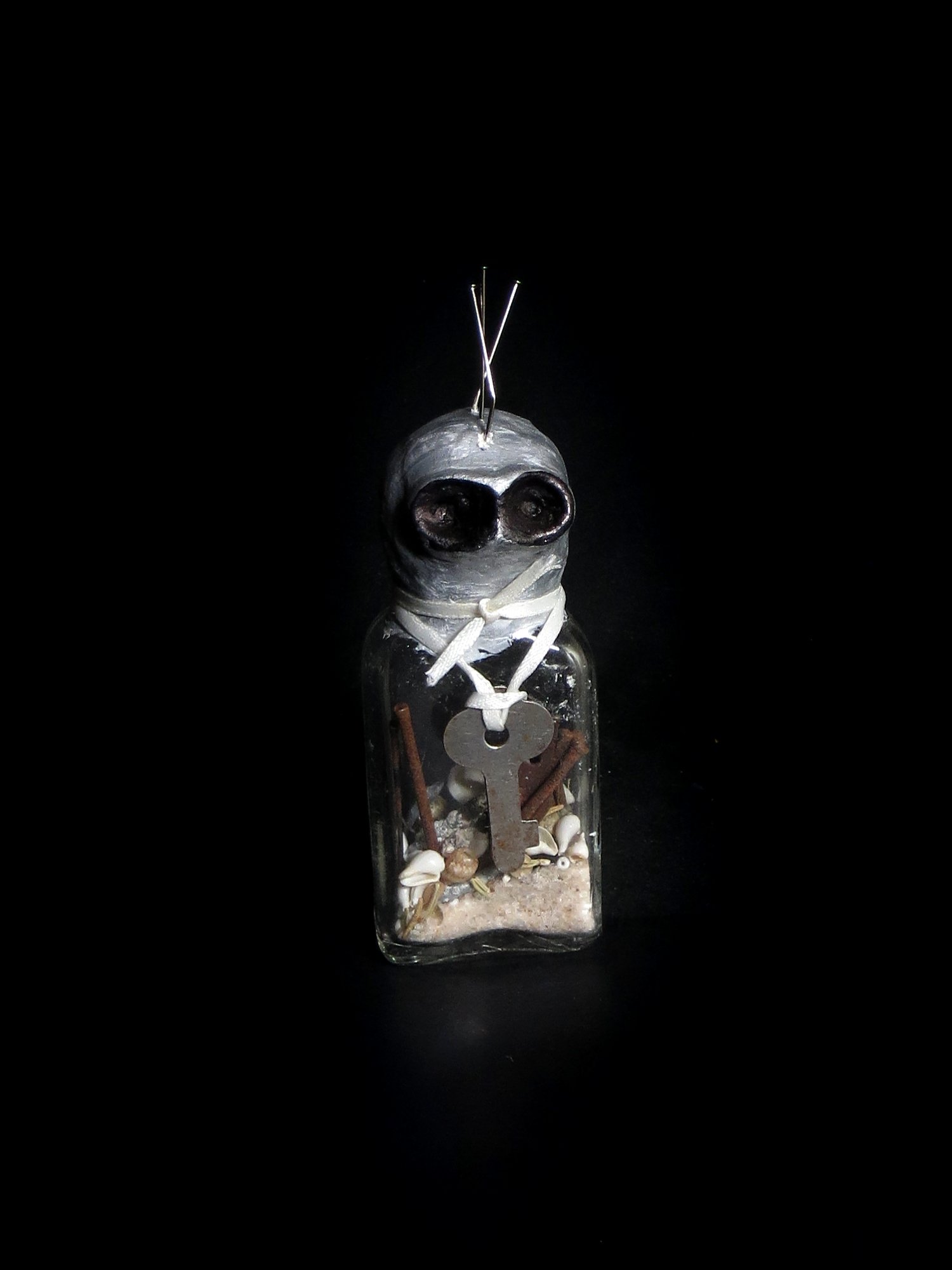 My bottles are filled with things of both entangling and reflective nature. This little bottle is about 3 inches tall and is filled with salt, rusted nails, shells, beads, glitter, and other bits of distraction. The head is sculpted over a permanently sealed top using air dry clay and has been painted with acrylics. They wear a necklace made from ribbon and an old key.